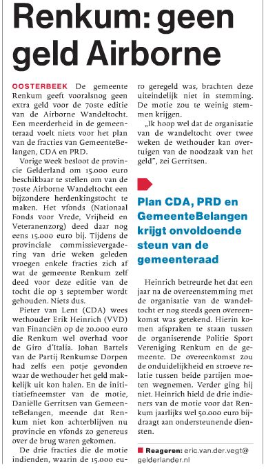 “Renkum: geen geld Airborne” en “Geen extra steun Airborne”
