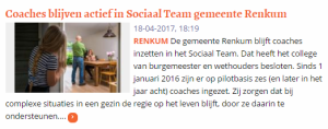 Sinds 1 januari 2016 zijn er op pilotbasis zes (en later in het jaar acht) coaches ingezet. Zij zorgen dat bij complexe situaties in een gezin de regie op het leven blijft, door ze daarin te ondersteunen. Daarbij zien zij erop toe dat deze ondersteuning past bij de mogelijkheden en behoeften van het gezin. Met dit besluit is de rol van de coaches in het Sociaal Team vanaf nu structureel, meldt de gemeente Renkum.